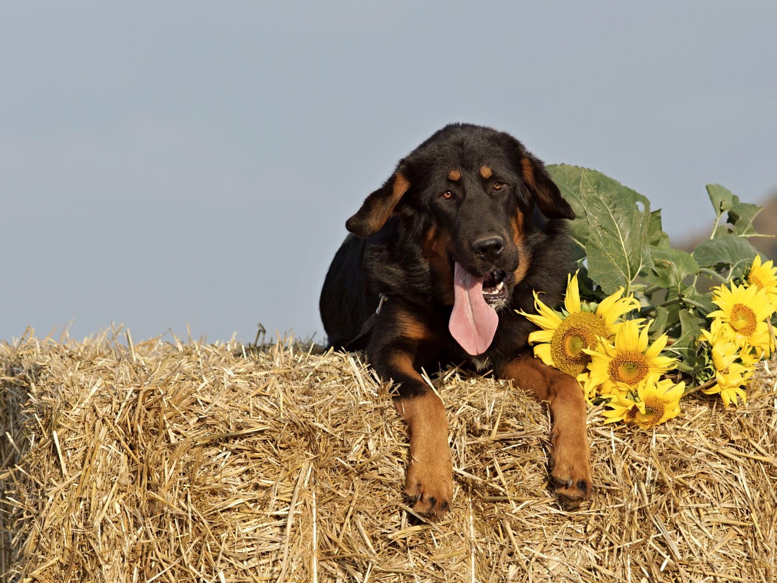 Обои Тибетский мастиф с высунутым языком лежит на соломе