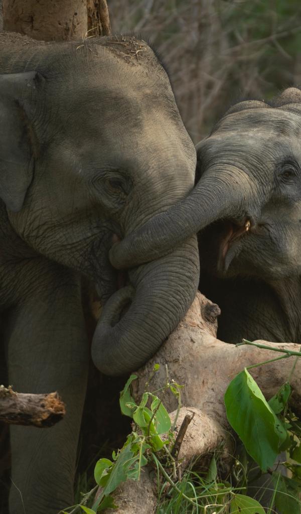Обои Большая слониха со слоненком у дерева