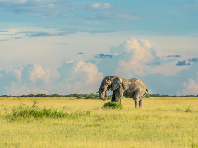Обои Большой серый слон идет по зеленой траве