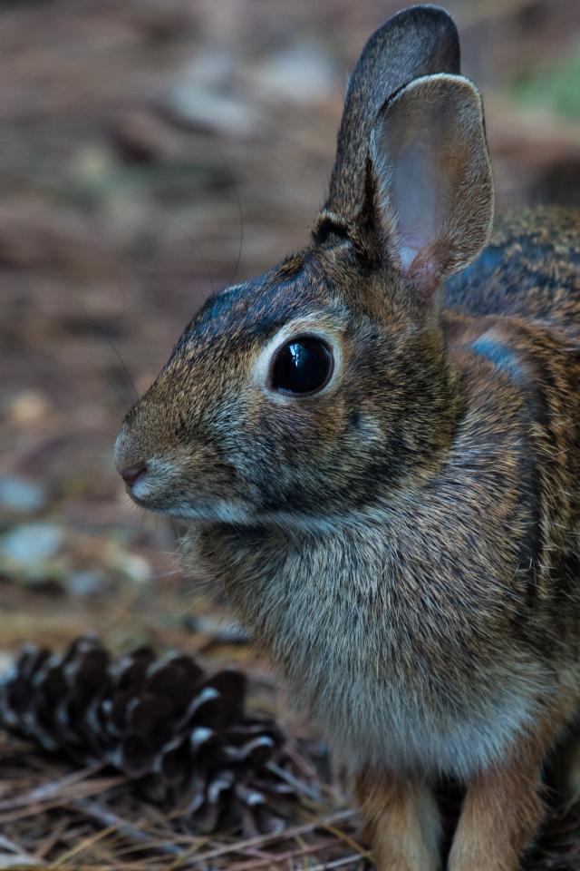 Обои Серый заяц сидит на траве с шишками
