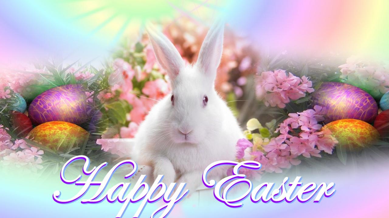 Обои Большой белый кролик с крашеными яйцами на Пасху