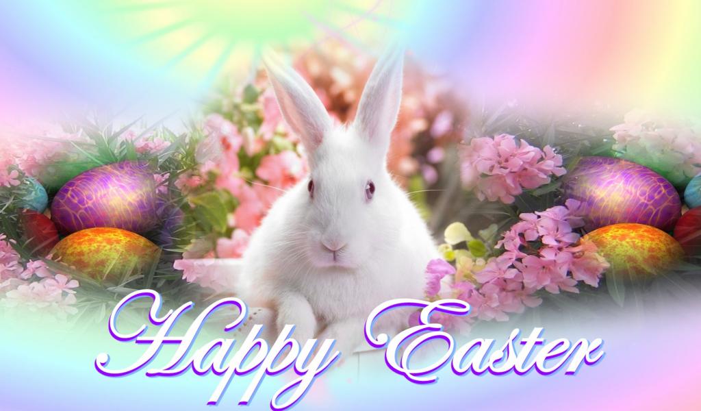 Обои Большой белый кролик с крашеными яйцами на Пасху