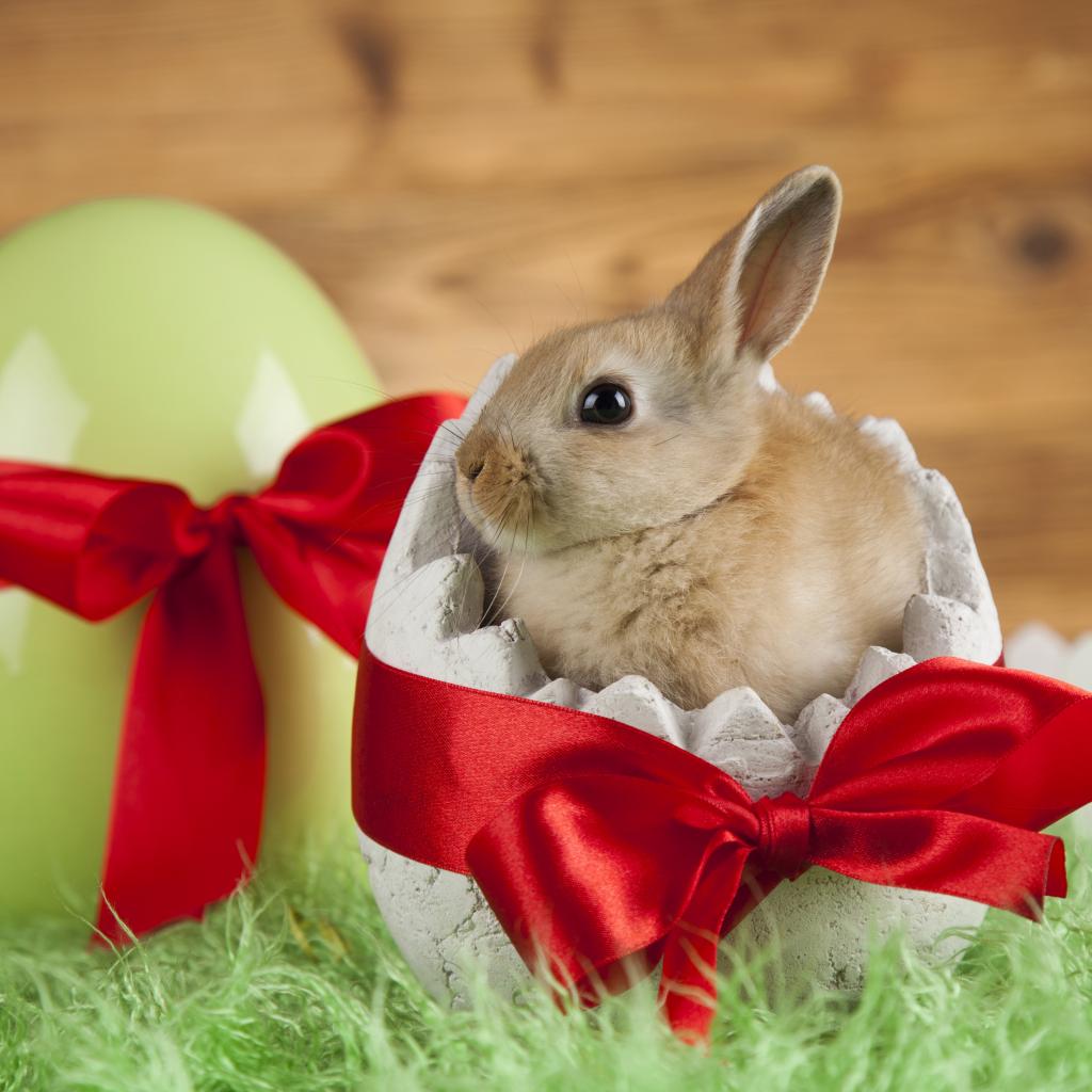 Обои Маленький декоративный кролик в яйце с красным бантом