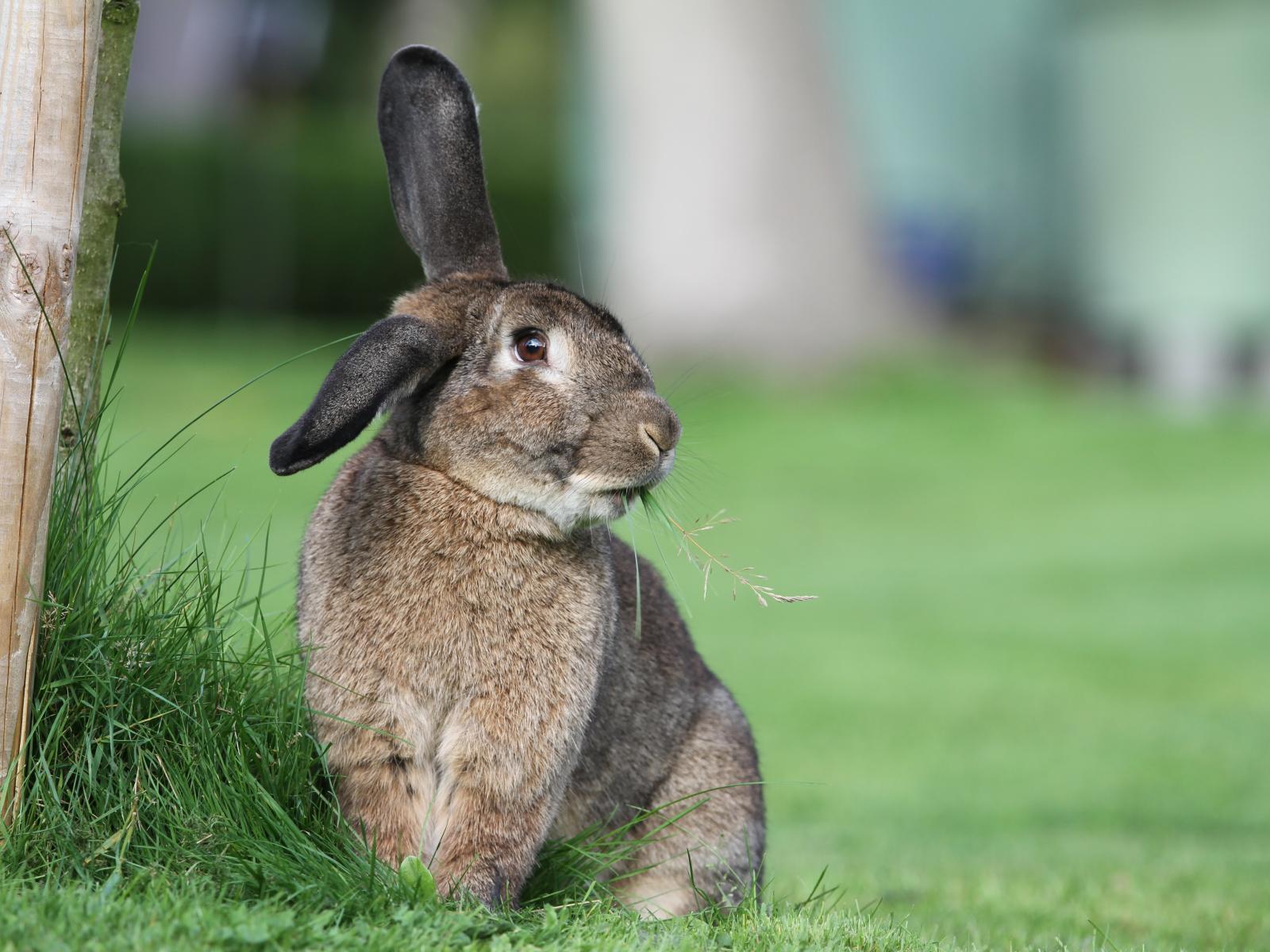 Обои Большой пушистый серый кролик на траве