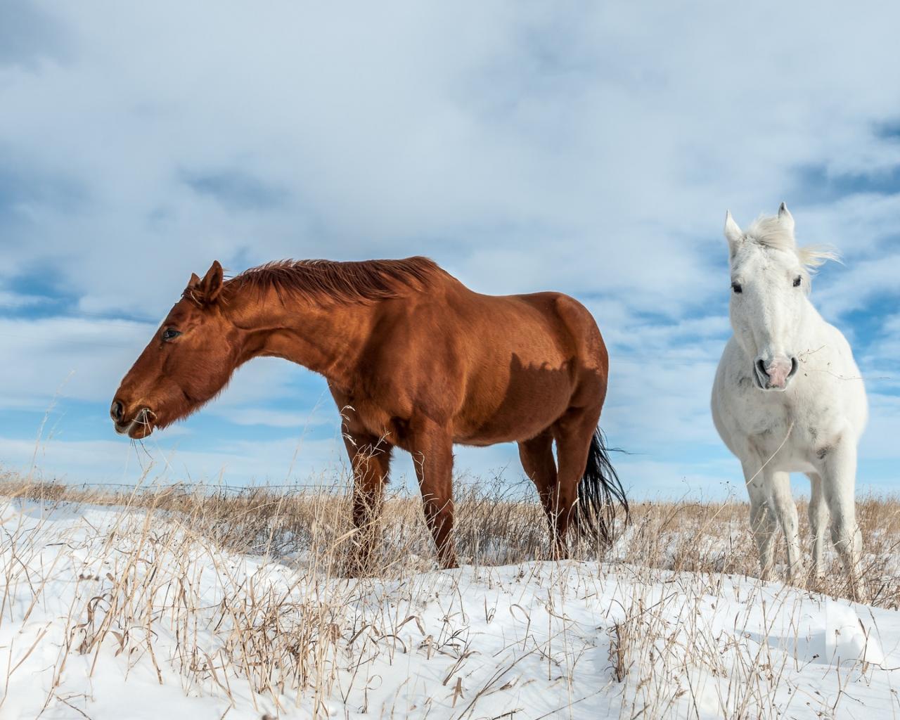 Обои Белая и коричневая лошадь пасутся на покрытом снегом поле