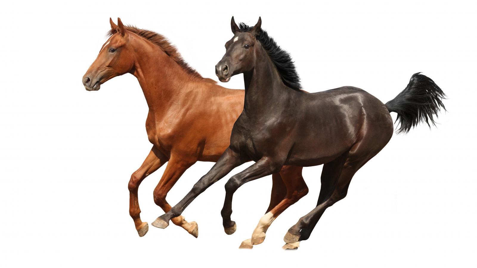 Обои Две коричневых лошади скачут на белом фоне