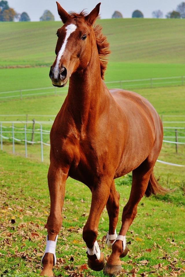 Обои Коричневая лошадь скачет по зеленой траве на ферме
