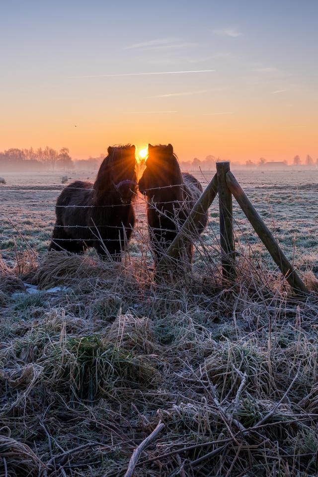 Обои Две лошади на ферме на покрытой инеем траве на рассвете