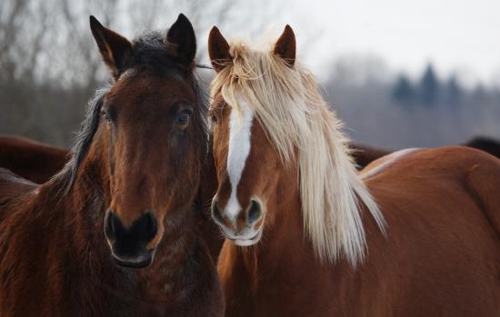 Обои Две коричневые лошади стоят на покрытой инеем траве