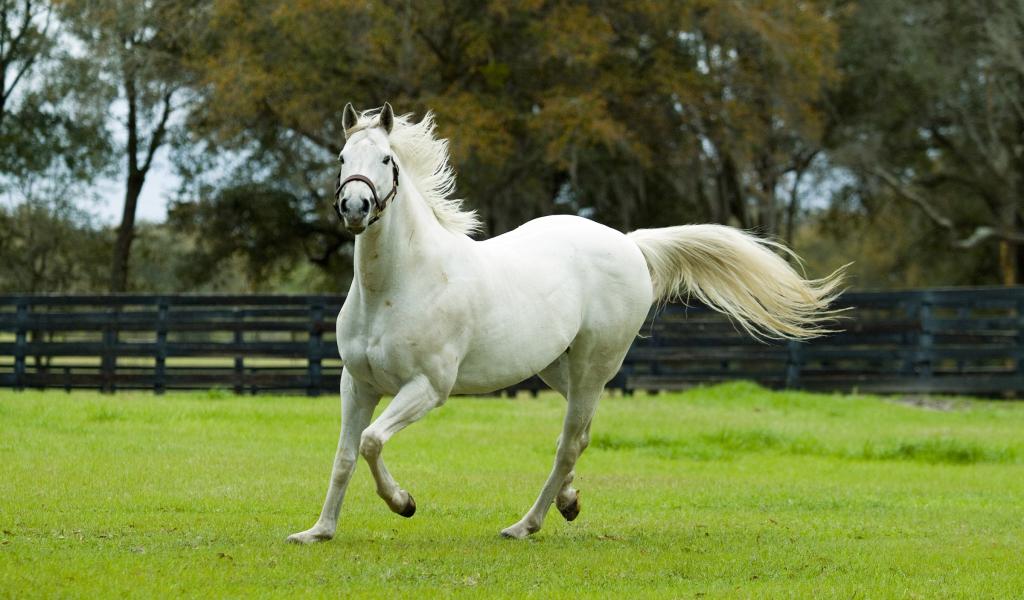 Обои Белая красивая лошадь скачет по зеленой траве