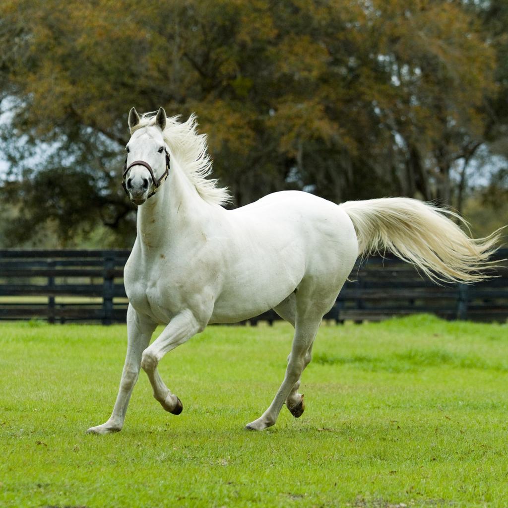 Обои Белая красивая лошадь скачет по зеленой траве