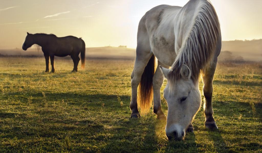 Обои Две лошади пасутся на зеленой траве на рассвете