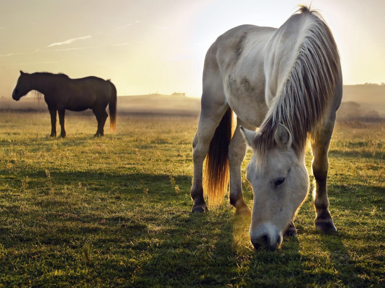 Обои Две лошади пасутся на зеленой траве на рассвете