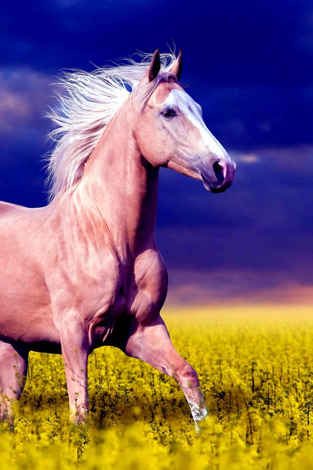 Обои Красивая коричневая лошадь скачет по желтым цветам