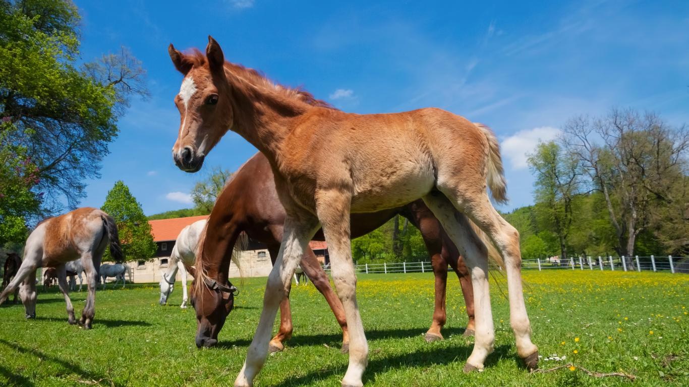 Обои Жеребенок на ферме с лошадьми на фоне голубого неба