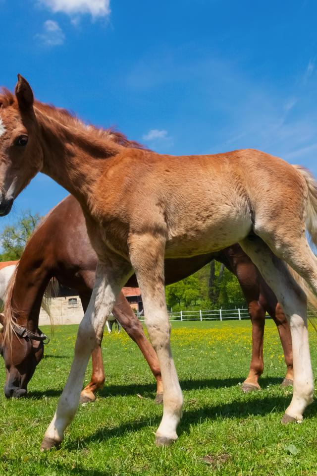 Обои Жеребенок на ферме с лошадьми на фоне голубого неба