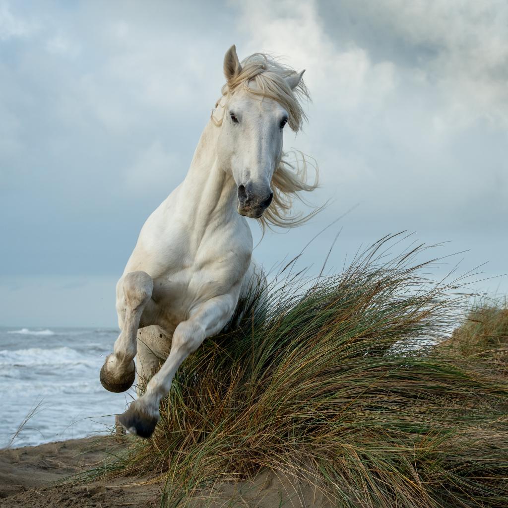 Обои Белая лошадь скачет по высокой траве у моря