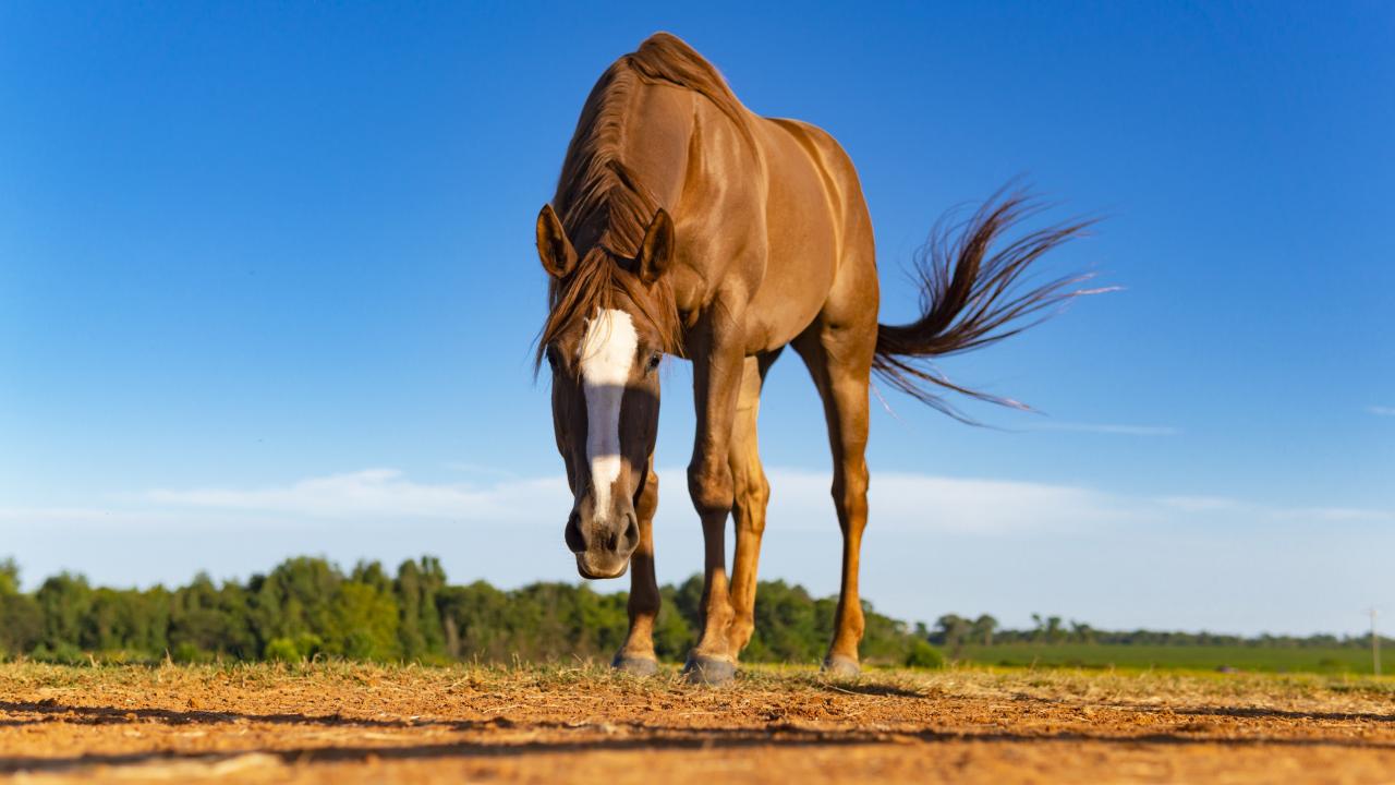 Обои Красивая коричневая лошадь пасется