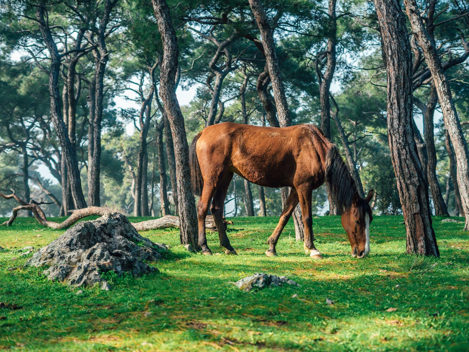 Обои Коричневая лошадь пасется на зеленой траве в лесу