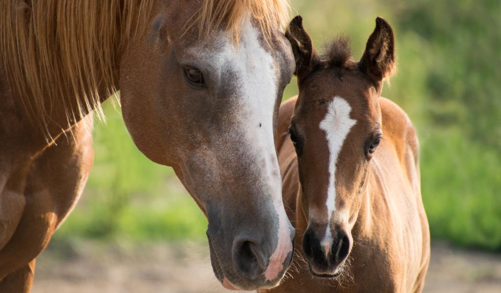 Обои Коричневая лошадь с жеребенком гуляет по полю с зеленой травой