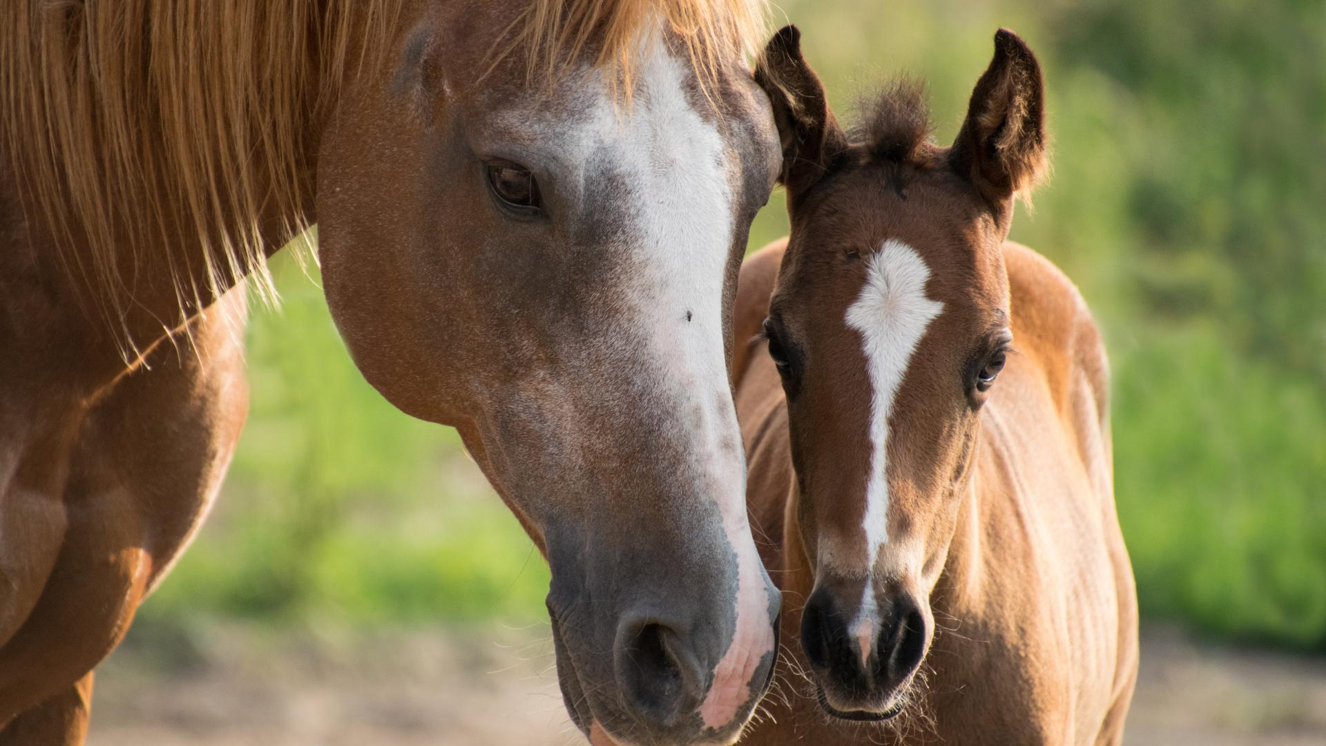 Обои Красивая лошадь с жеребенком скачут по зеленой траве