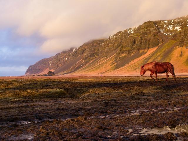 Обои Коричневая лошадь пасется на фоне горы