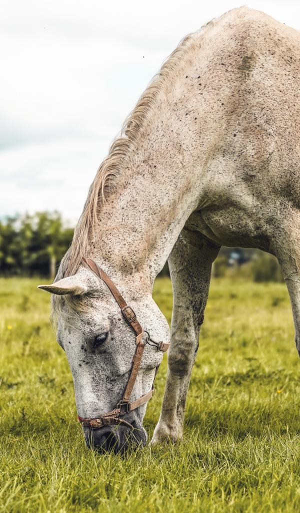 Обои Большая белая лошадь пасется на зеленой траве