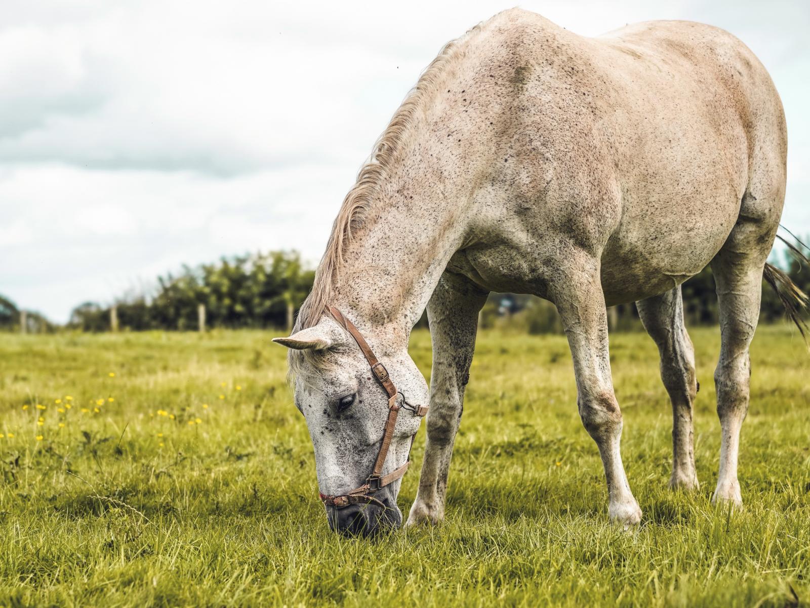 Обои Большая белая лошадь пасется на зеленой траве