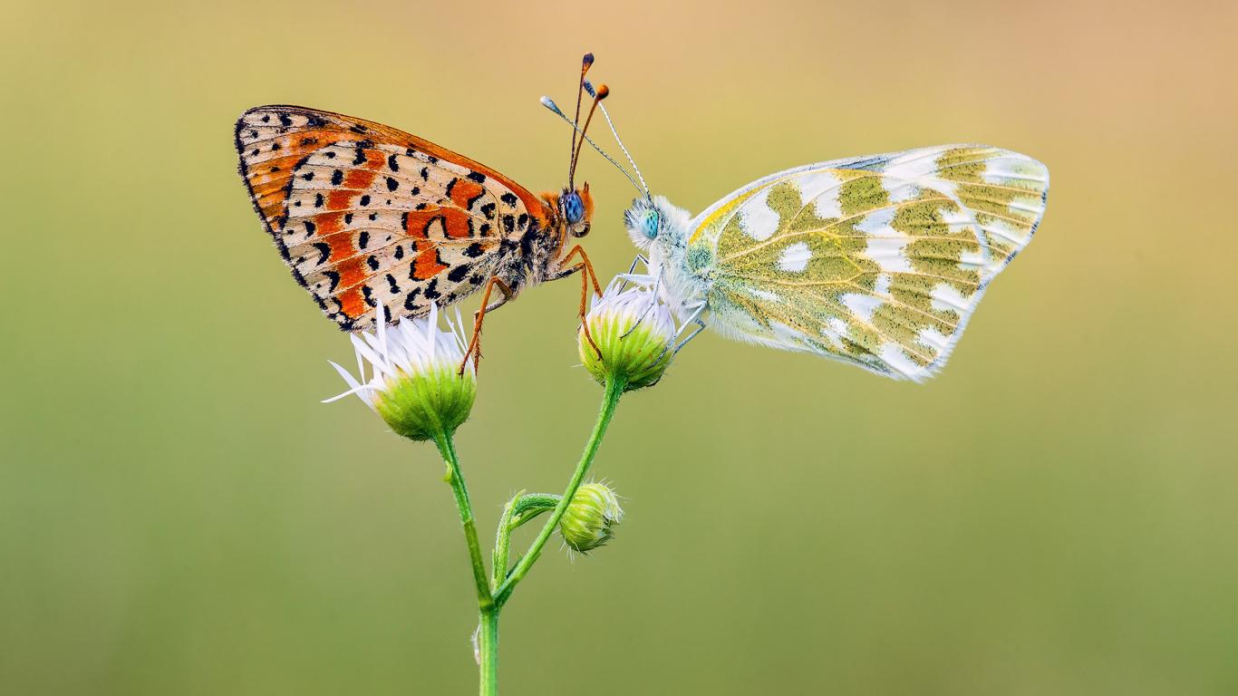 Обои Две красивых разноцветных бабочки на цветке