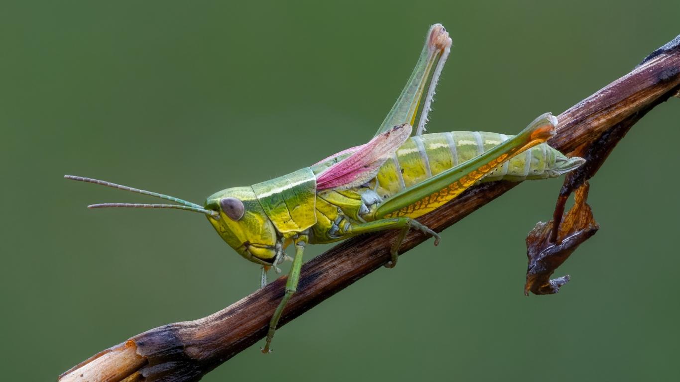 Обои Зеленый кузнечик на ветке крупным планом