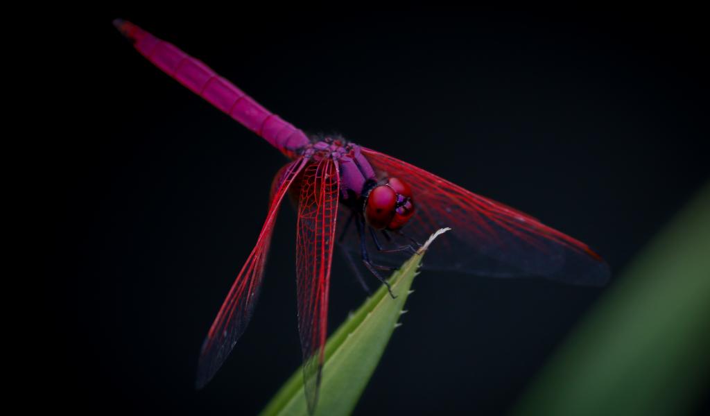 Обои Красная стрекоза сидит на зеленом листе