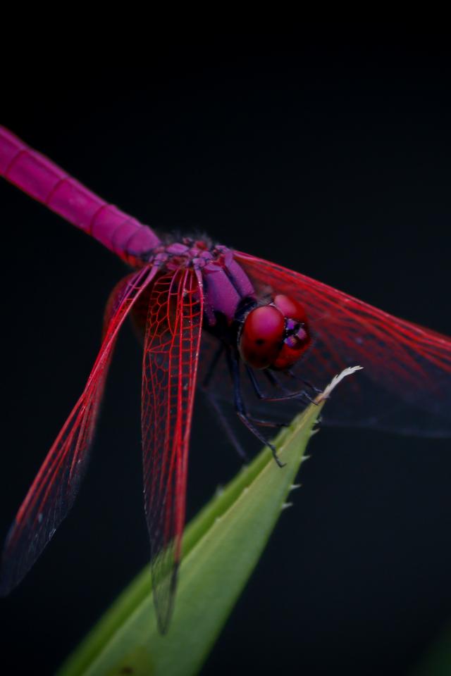Обои Красная стрекоза сидит на зеленом листе