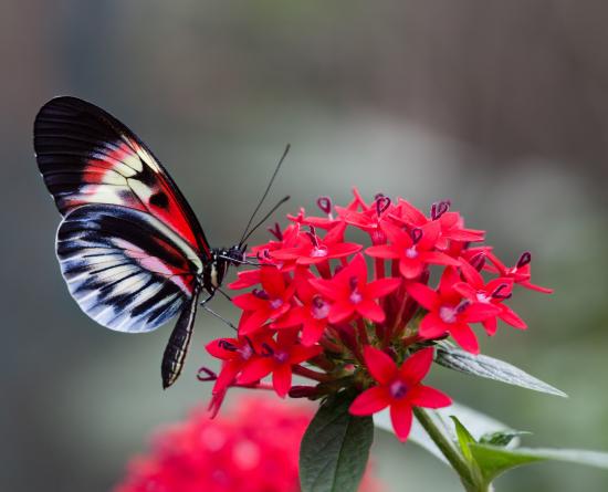 Обои Красивая зеленая бабочка сидит на красном цветке