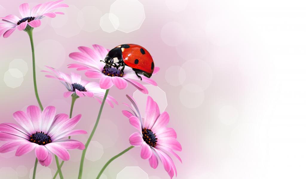 » Обои Маленькая божья коровка сидит на розовом цветке герберы