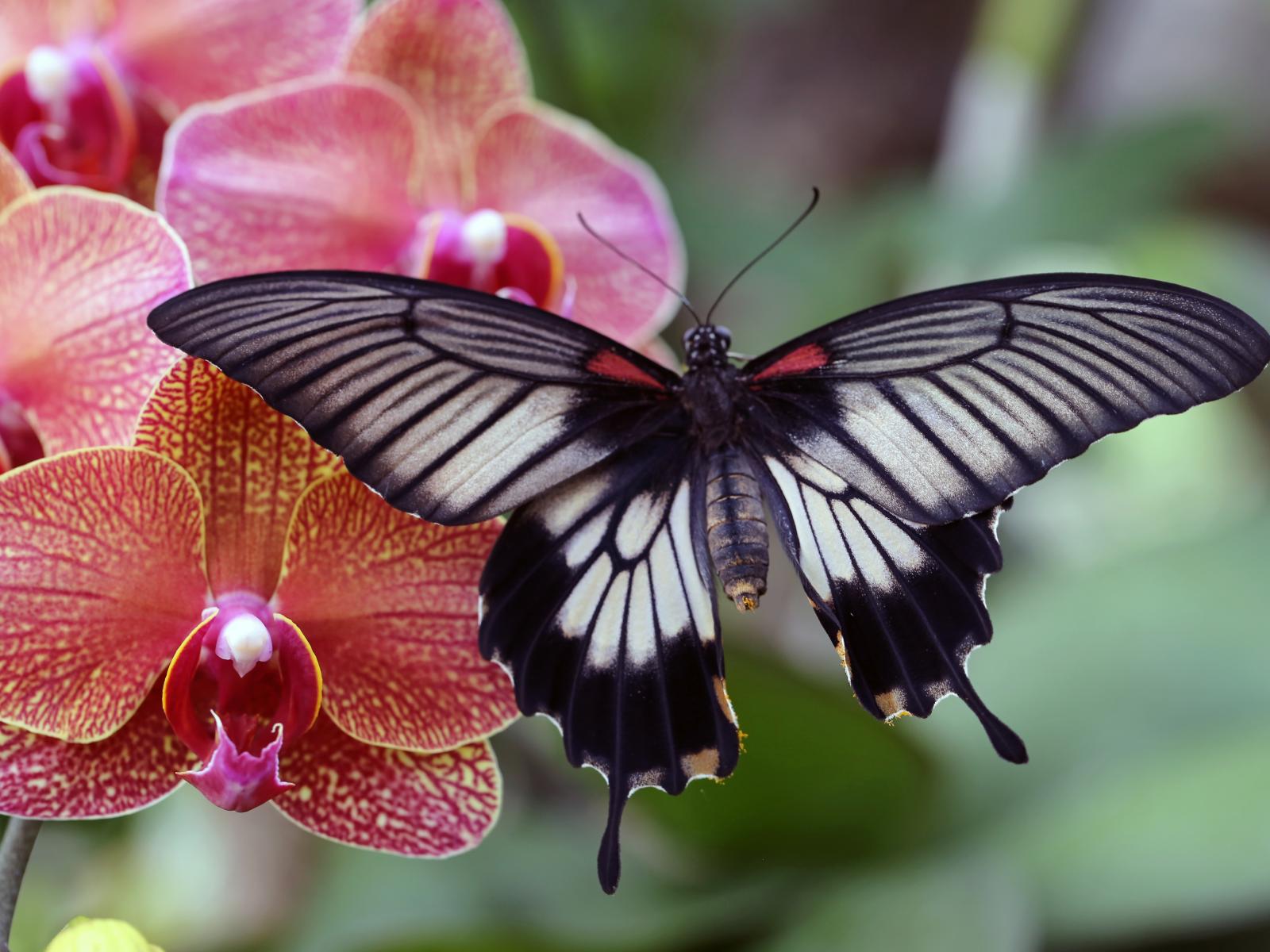Обои Красивая бабочка сидит на цветке розовой орхидеи