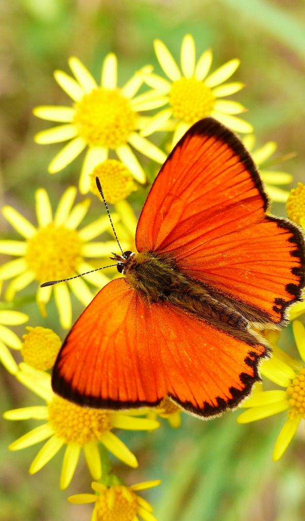 Обои Красивая оранжевая бабочка сидит на желтом цветке