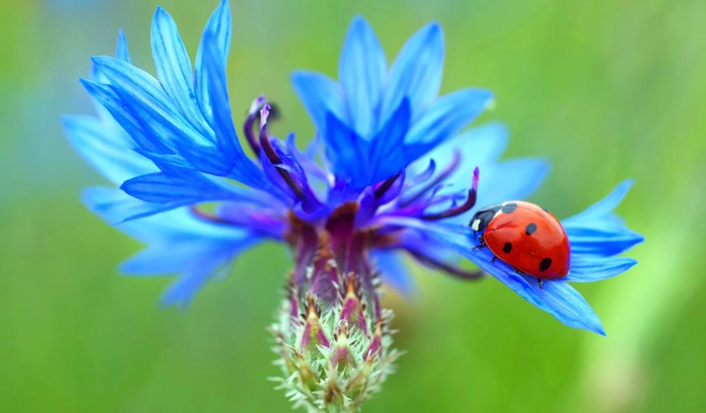 Обои Божья коровка сидит на голубом васильке