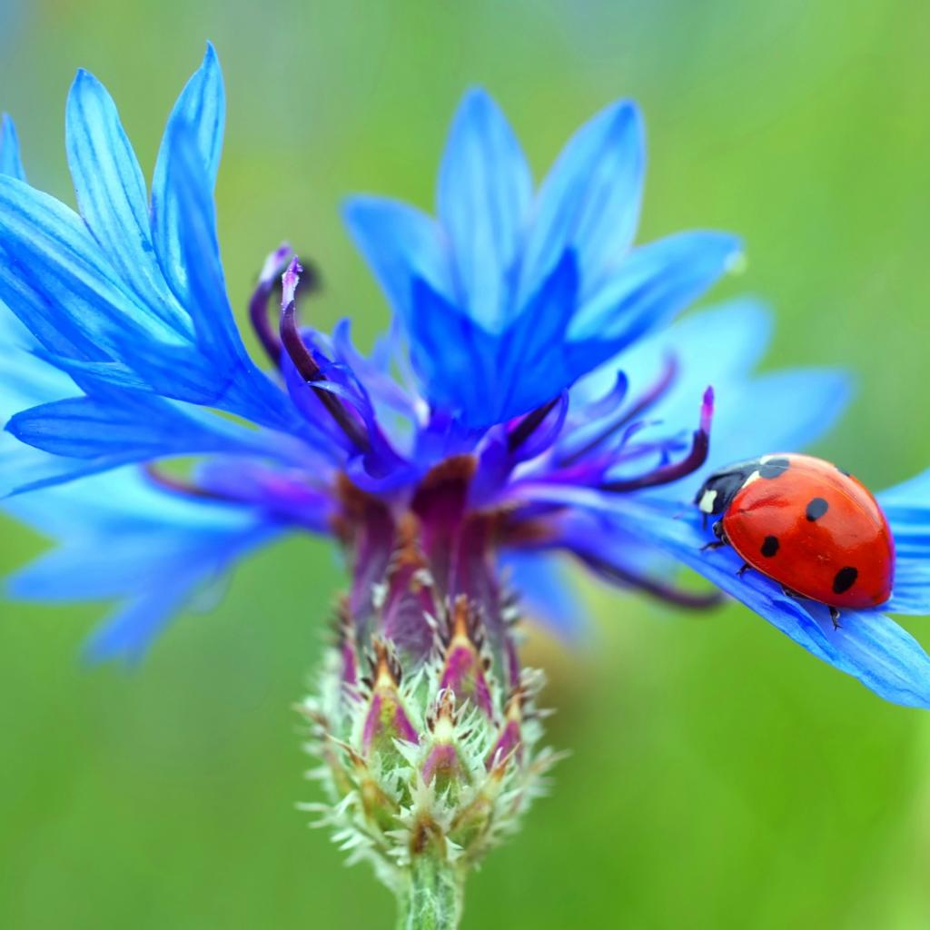 Обои Божья коровка сидит на голубом васильке