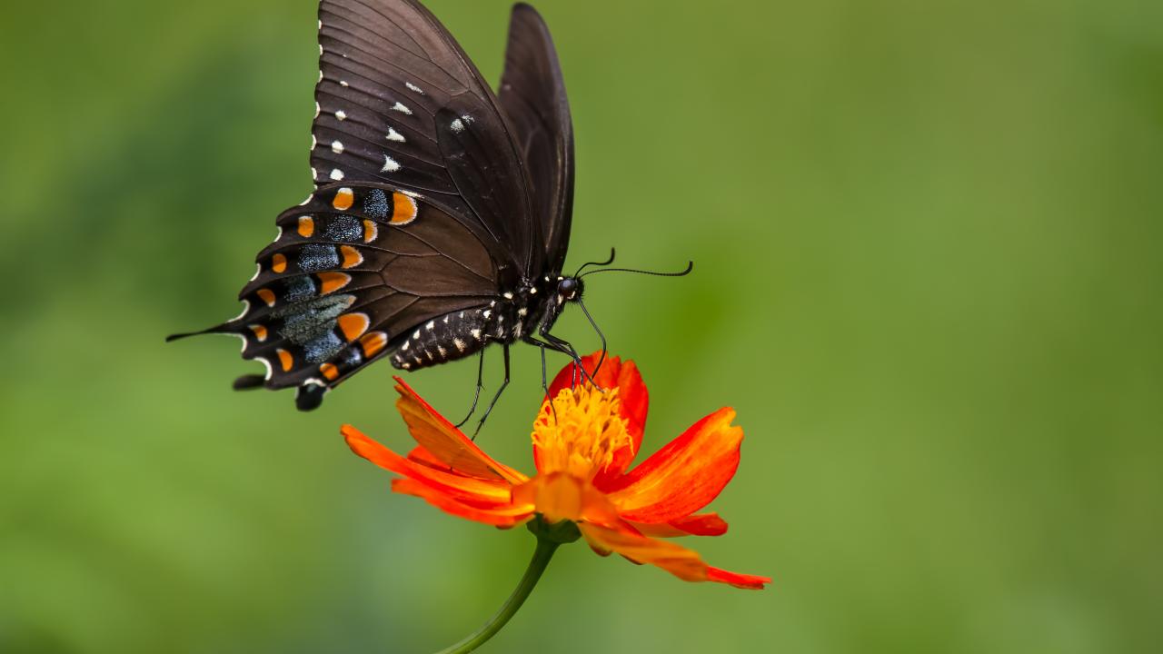 Обои Красивая бабочка сидит на оранжевом цветке