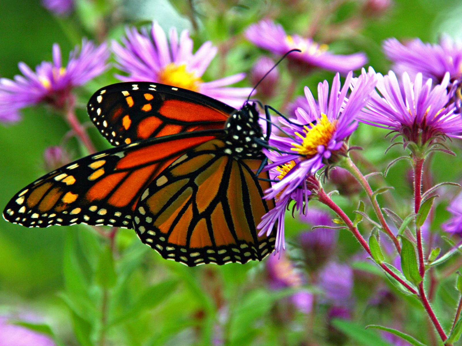 Обои Бабочка монарх сидит на сиреневом осеннем цветке