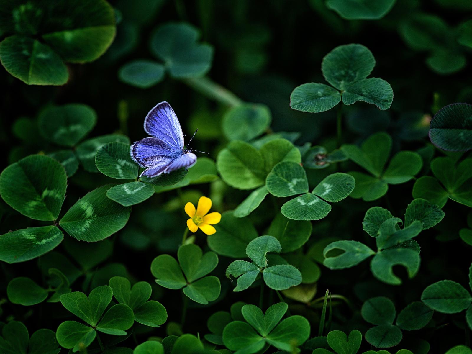 Обои Маленькая голубая бабочка сидит на зеленом листе