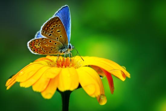 Обои Красивая голубая бабочка сидит на оранжевом цветке