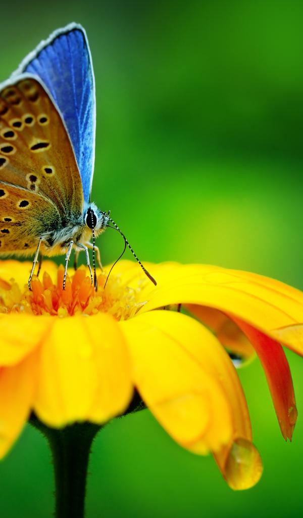 Обои Красивая голубая бабочка сидит на оранжевом цветке