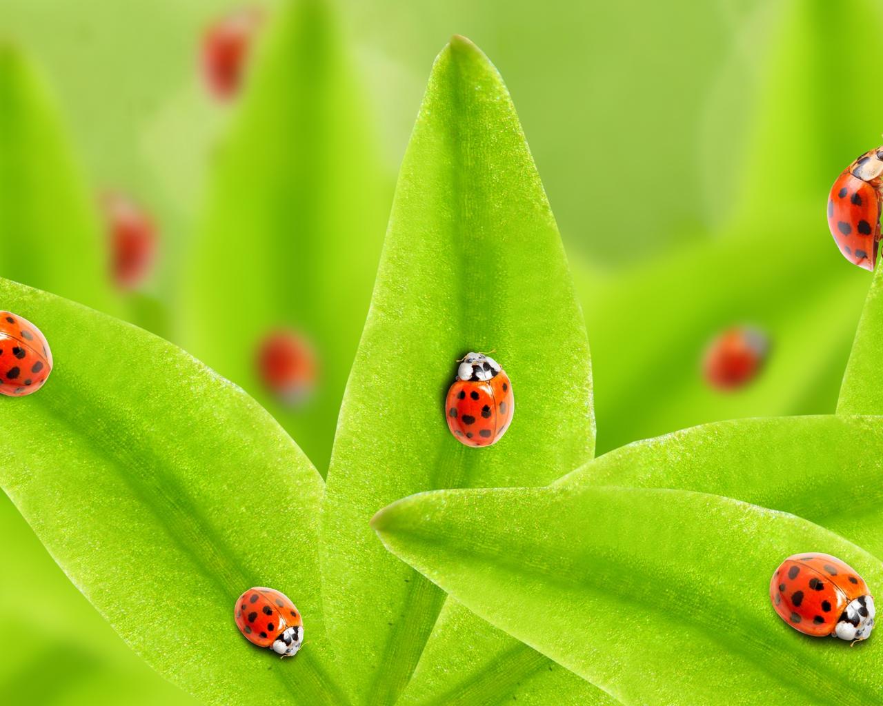 Обои Много божьих коровок на зеленых листьях