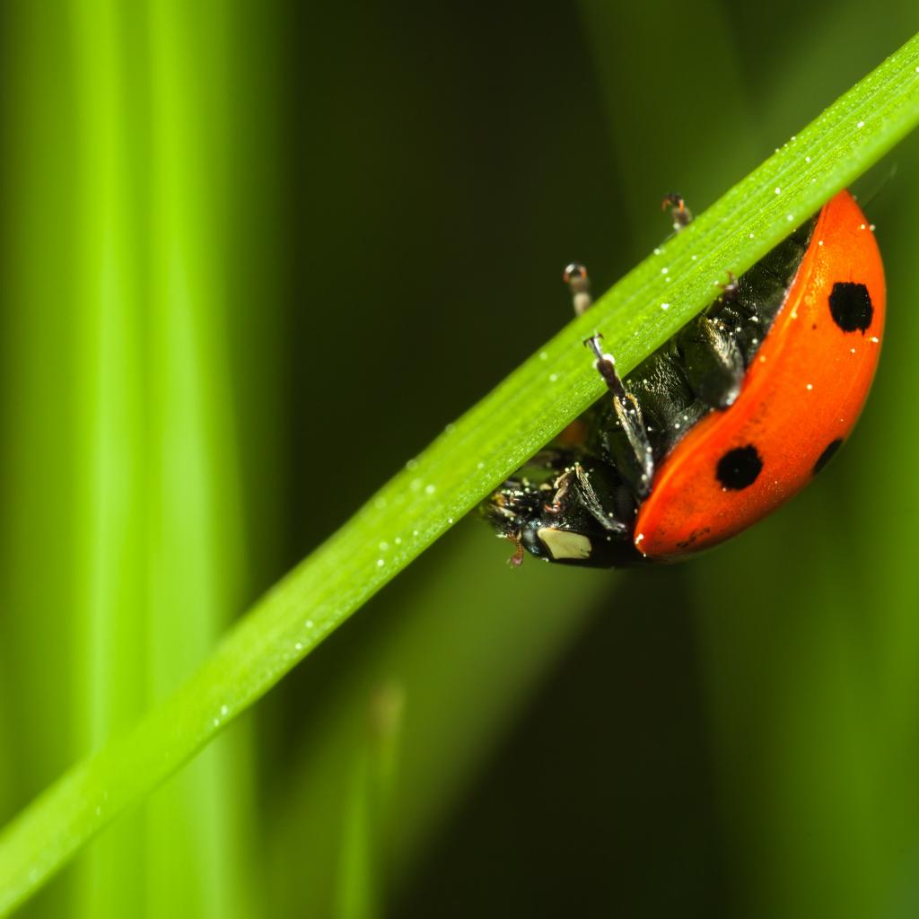 Обои Маленькая красная божья коровка сидит на зеленой траве