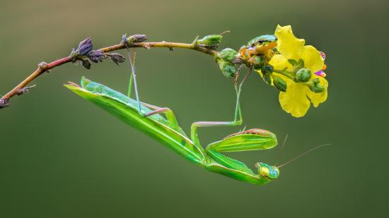Обои Зеленый богомол сидит на желтом цветке
