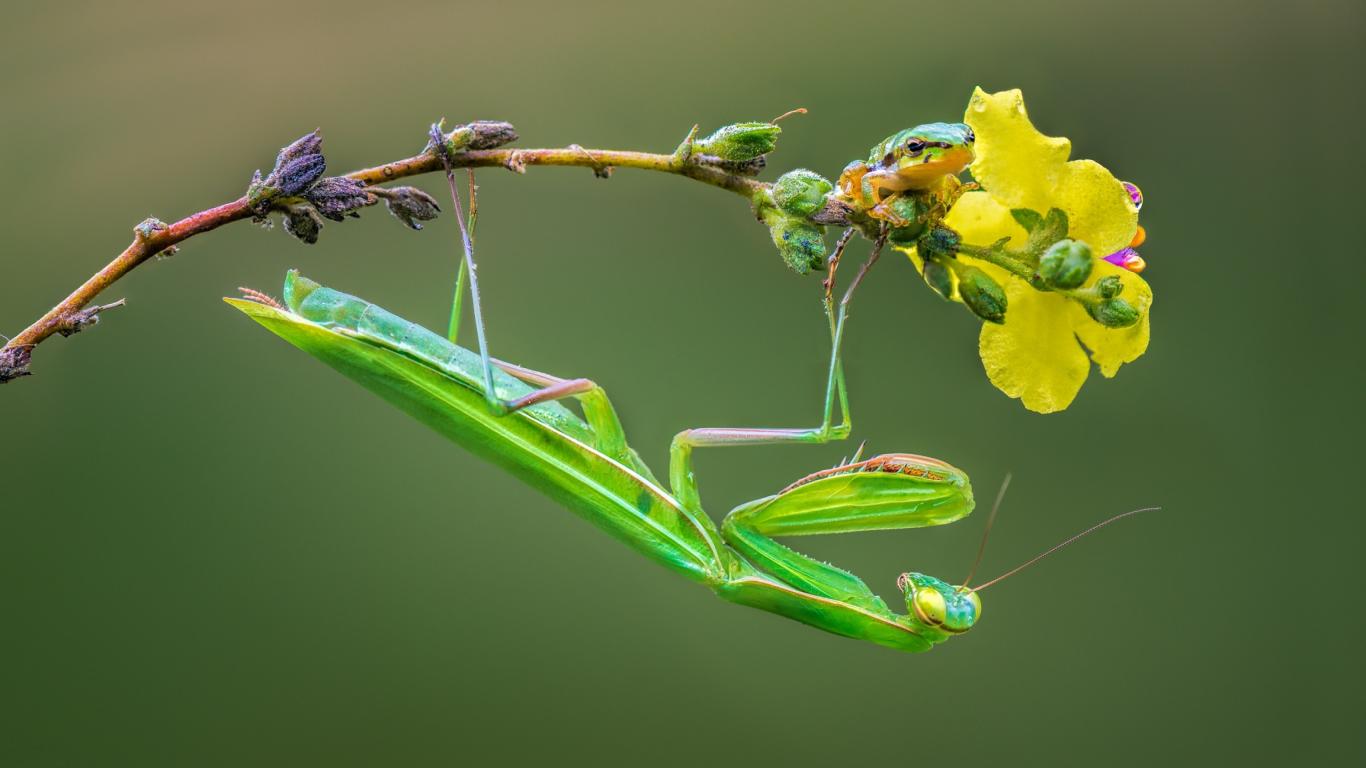 Обои Зеленый богомол сидит на желтом цветке