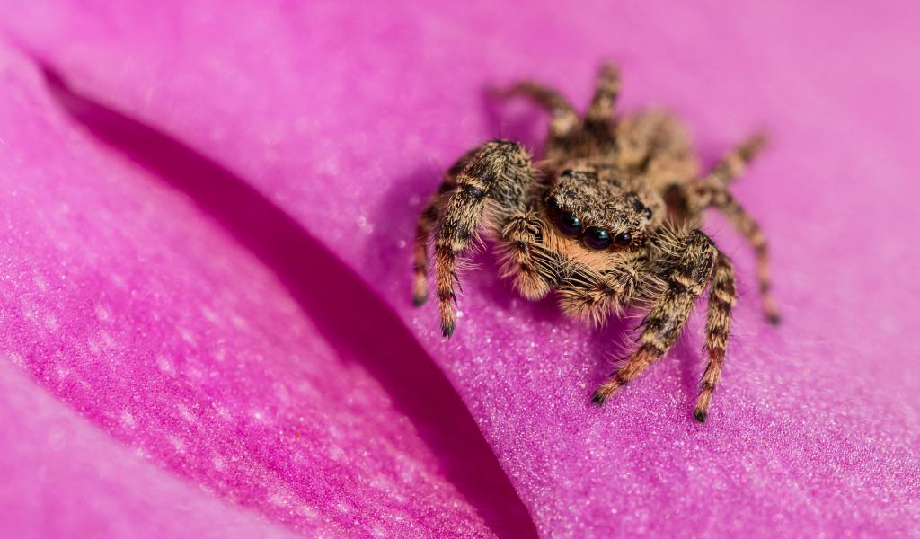Обои Паук крупным планом на розовом лепестке