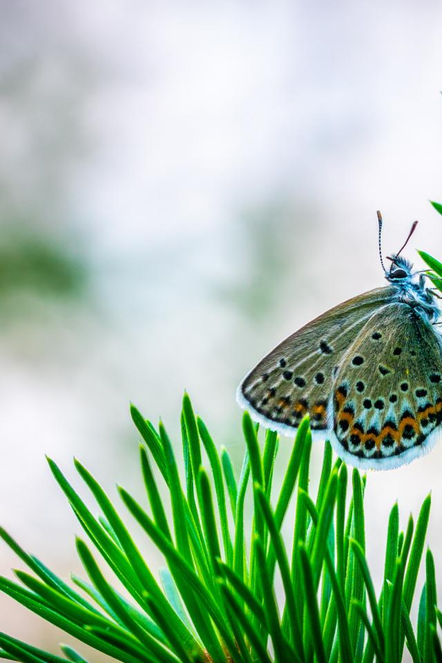 Обои Бабочка сидит на зеленой ветке ели