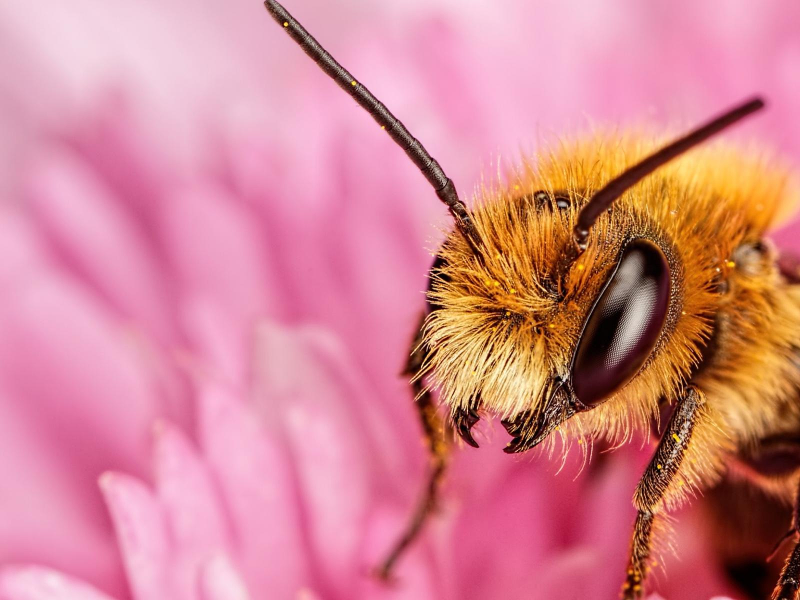 Обои Пчела на розовом цветке крупным планом